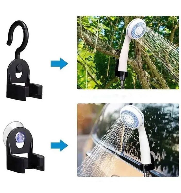 دوش کمپینگ شارژی دارای دو نوع گیره میباشد که گیره قلابی برای آویزان کردن آن به شاخه درخت و چیزهایی از این قبیل و گیره چسبونکی برای چسباندن آن به سطوح صاف مثل شیشه ماشین به کار میرود. همچنین میتوانید به صورت دستی از این دوش مسافرتی استفاده کنید.