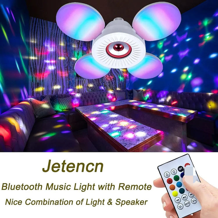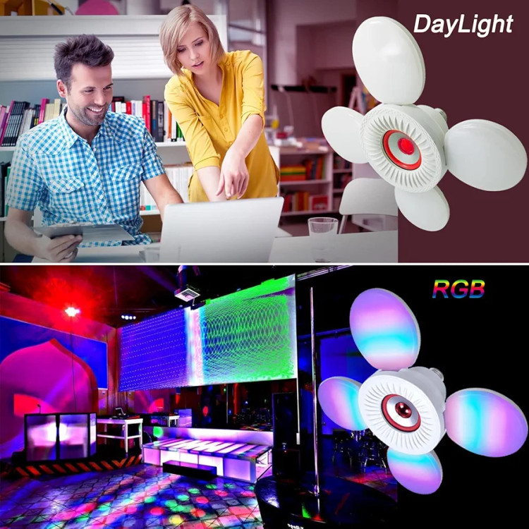این لامپ LED هوشمند دارای ریموت کنترل جهت تنظیم رنگ و کنترل موسیقی شما میباشد. این لامپ میتواند فقط به رنگ مهتابی و با توان ۳۶ وات که بسیار قوی و پر نور است روشن شود و دارای رنگهای متنوع دیگر نیز میباشد و با کمک بلوتوث به تلفن همراه شما جهت پخش موسیقی باکیفیت متصل میشود. این لامپ دارای یک اسپیکر در مرکز آن و ۴ پره نورانی قابل تاشو شدن و قابل تنظیم زاویه پره ها تشکیل شده است. این محصول گزینه مناسبی برای استفادههای روزانه و همچنین دورهمی ها میباشد و هم زیبایی و هم صدای اسپیکر با کیفیت میباشد و میتواند در برگزاری هرچه بهتر مراسمات شما کمک کننده باشد.