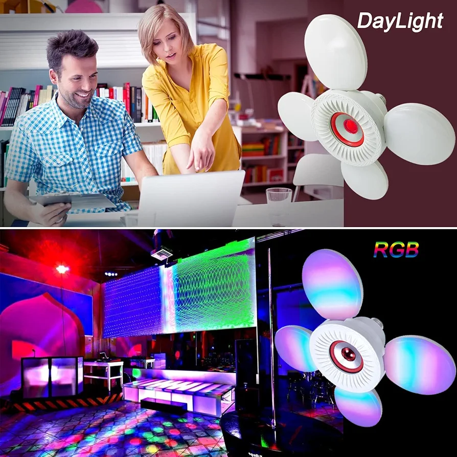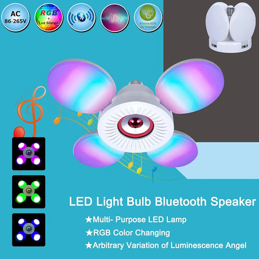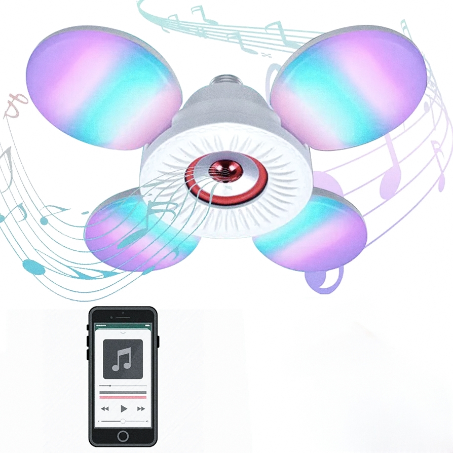 این لامپ LED هوشمند دارای ریموت کنترل جهت تنظیم رنگ و کنترل موسیقی شما میباشد. این لامپ میتواند فقط به رنگ مهتابی و با توان ۳۶ وات که بسیار قوی و پر نور است روشن شود و دارای رنگهای متنوع دیگر نیز میباشد و با کمک بلوتوث به تلفن همراه شما جهت پخش موسیقی باکیفیت متصل میشود. این لامپ دارای یک اسپیکر در مرکز آن و ۴ پره نورانی قابل تاشو شدن و قابل تنظیم زاویه پره ها تشکیل شده است. این محصول گزینه مناسبی برای استفادههای روزانه و همچنین دورهمی ها میباشد و هم زیبایی و هم صدای اسپیکر با کیفیت میباشد و میتواند در برگزاری هرچه بهتر مراسمات شما کمک کننده باشد.