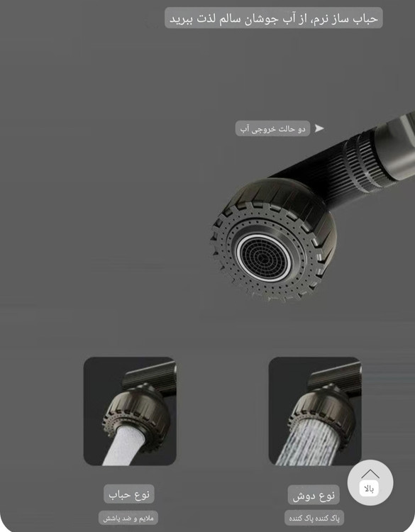 شیر آب بازویی مدل تلسکوپی یک کالای شیک جدید و کاربردی است. این شیر دارای سه بازوی ۳۶۰ درجه است. بنابراین می توان آن را تقریبا به هر حالتی تنظیم کرد. همچنین این شیر دارای ۲حالت خروجی آب ساده و آبشاری می باشد.