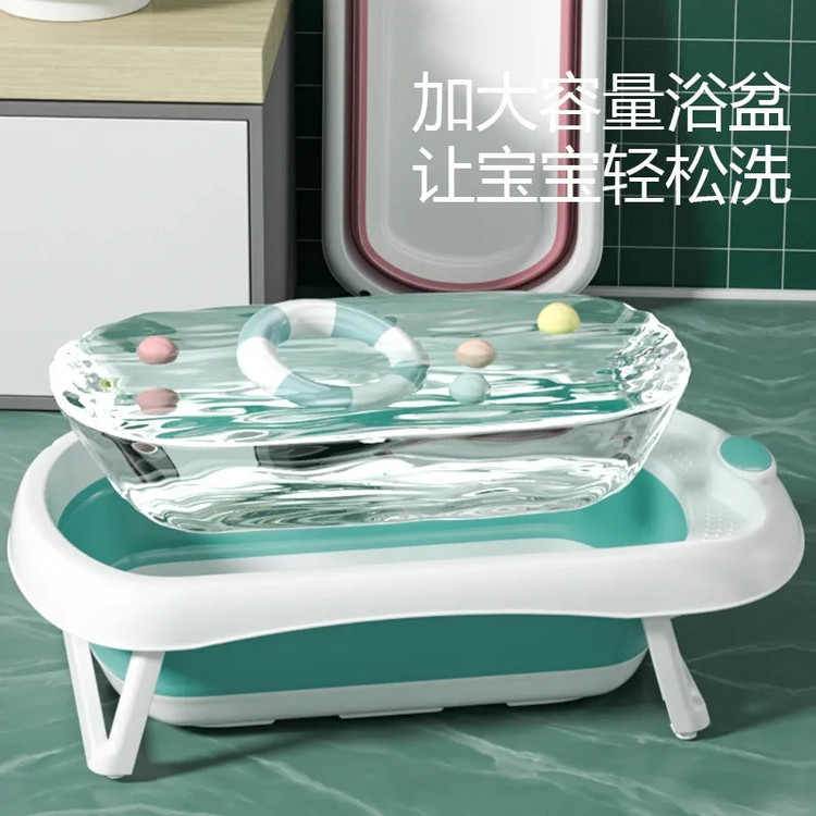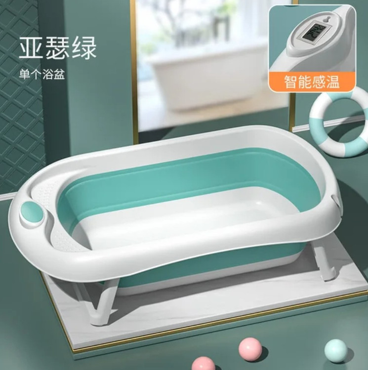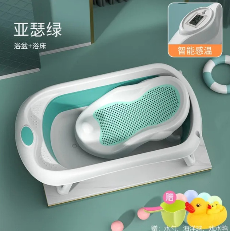 تخت حمام، لیف حمام، اسباب بازی های کوچک شامل توپ، قاشق آب و اردک آبی