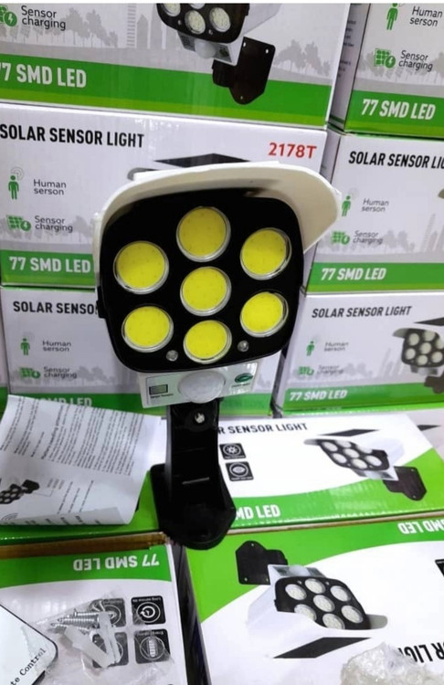 چراغ سنسور دار خورشیدی مدل 2178T نوعی از چراغ های سولار خورشیدی با طرح دوربین می باشد که دارای سنسور حرکت در شب بوده و هنگام تشخیص حرکت، حالت نور قوی روشن می شود. همچنین این پروژکتور در حالت خاموشی دارای چراغ چشمک زن قرمز است که برای شبیه سازی حالت ضبط دوربین اعمال می شود. این محصول دارای نور مهتابی است و همچنین دارای کنترل برای تغییر حالت و نوع استفاده از آن نیز است. تعداد حالت استفاده از این پروژکتور، 3 حالت می باشد. طرز کار پروژکتور به این صورت است که در شعاع پنج متری آن در صورت حرکت، خودکار روشن می شود و به مدت 20 ثانیه روشن می ماند که وسیله ای مناسب برای تامین امنیت می باشد. این محصول هیچ نیازی به سیم کشی و برق ندارد و انرژی خود را از نور تامین می کند. این نورافکن خورشیدی دارای 77 ال ای دی اس ام دی می باشد که دارای استاندارد IP65 بوده و می توان آن را بی هیچ نگرانی بیرون خانه در مقابل باران و رطوبت نصب کرد.