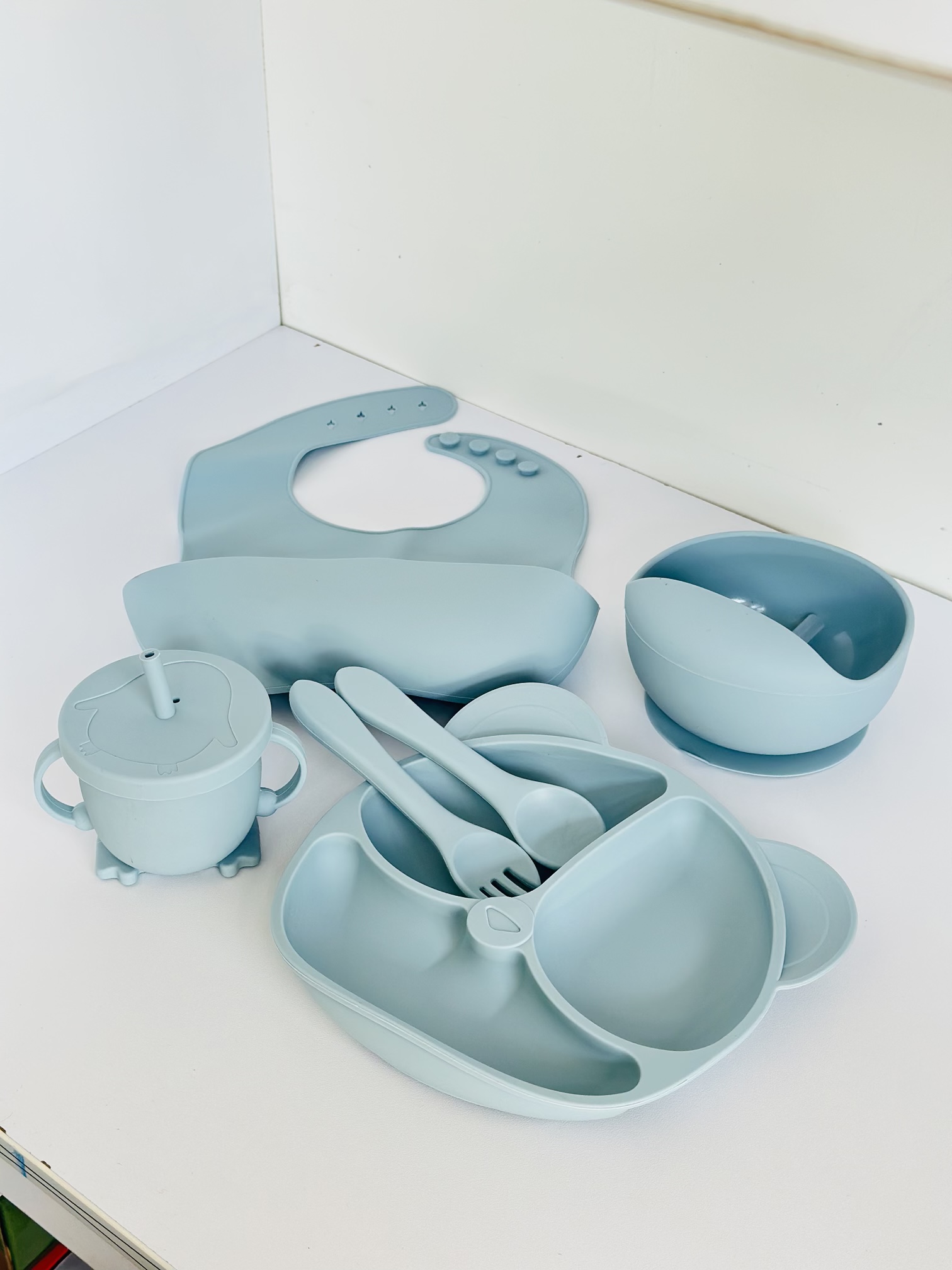 قاشق و چنگال، لیوان، سری نیدار لیوان، پیشبند، بشقاب سه قسمتی، کاسه لبه دار