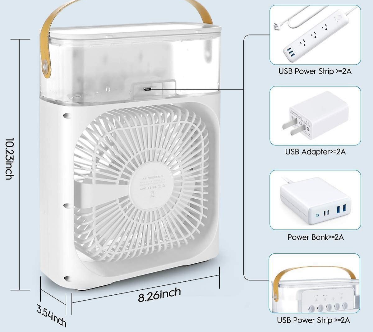 این پنکه مه پاش، با دارا بودن توان 10 وات، به یک ورودی 5V/2A و یک خروجی تایپ C مجهز بوده و این امکان را به شما میدهد تا پنکه خود را به راحتی از طریق لوازمی مانند پاوربانک، مورد استفاده قرار دهید. پرههای این پنکه به گونهای طراحی شده است که از قابلیت چرخش 60 درجه برخوردار بوده و این امکان را به شما میدهد تا جهت باد آن را به دلخواه خود تنظیم کنید. یک دسته چرمی نیز، برای این پنکه مه پاش در نظر گرفته شده است تا بتوانید به راحتی آن را در دست گرفته و جابهجا کنید. یک کابل USB نیز، به همراه این محصول ارائه شده است.
