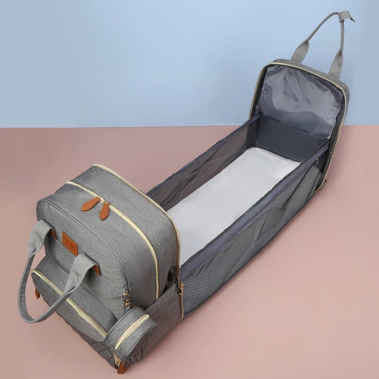 برای تبدیل کردن این کوله پشتی به یک تخت خواب کودک زیپ پشتی که دورتادور کوله پشتی قرار دارد را کاملا باز نمایید و قسمت جلو و پشت کوله را کاملا از هم جدا کنید و بکشید تا محفظه مربوط به جای خواب کامل باز شود، حال میله های موجود در کیف را داخل محفظه مخصوص در بالای دیواره توری قرار دهید تا جای خواب ایستایی خوبی داشته باشد. حال زیرانداز را در جای خواب پهن کنید.