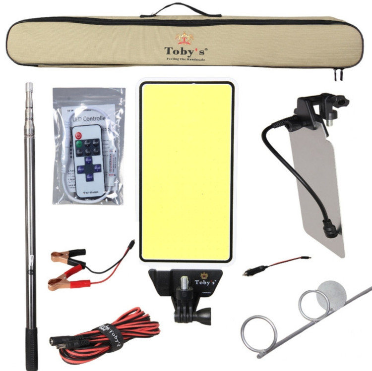 پایه ۳.۵ متری تلسکوپی _ سیم اتصال ۵ متری با سری فندکی _ تبدیل سوکت برای اتصال به باتری خودرو _ استند نگهدارنده فلزی _ براکت صفحه نور _ کابل اتصال به جا فندکی خودرو _ کابل دارای گیره سوسماری جهت اتصال به باتری خودرو _ ریموت کنترل از راه دور
