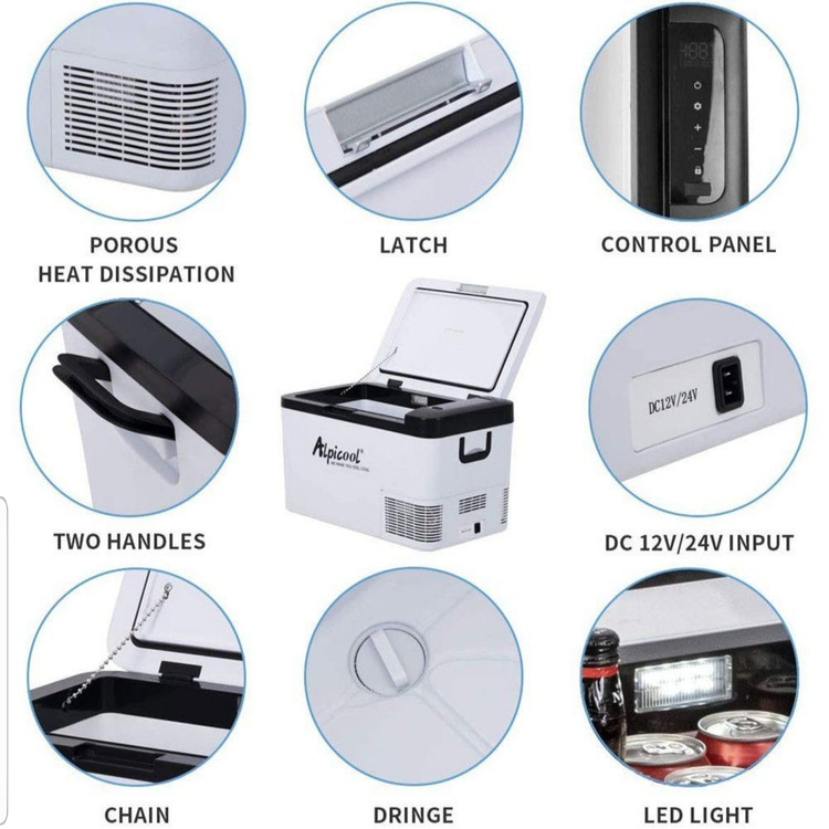 در بخش داخلی این محصول یک چراغ برای روشنایی داخل یخچال و مشاهده مواد غذایی و نوشیدنی ها تعبیه شده است. در ضمن ساختار این یخچال کاملا بدون درز و دارای عایق بندی بسیار قوی می باشد که از خروج برودت و ورود گرما جلوگیری می کند. به طوری که تا 10 ساعت پس از خاموش شدن یخچال نیز دمای تعیین شده را حفظ می کند. طراحی درب و بدنه این محصول نیز به گونه ای است که در برابر لغزش بسیار مقاوم بوده و باعث شده تا در تکان های شدید جاده ای به حفظ ایمنی دستگاه کمک کند. همچنین برای خروج راحت تر آب داخل یخچال یک دریچه در انتهای آن تعبیه شده که با باز کردن آن به راحتی آب از کف یخچال فریزر خارج می شود. قابلیت دیگری که برای درب یخچال، هنگام باز کردن در نظر گرفته شده استفاده از یک زنجیر است تا از افتادن ناگهانی آن به عقب جلوگیری شود. یخچال فریزر 25 لیتری آلپیکول با وجود دو دستگیره در کناره ها، به آسانی حمل می شود. همچنین از دیگر ویژگی های این یخچال می توان به نویز بسیار اندک و کمتر از 45 دسی بل آن اشاره نمود.