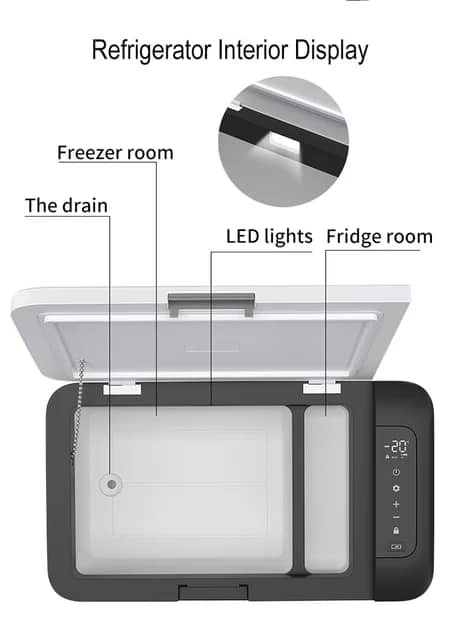 در قسمت پشت این محصول پورت اتصال برق AC و DC تعبیه شده و همچنین قسمت بالایی آن مجهز به یک صفحه نمایشگر با پنل دیجیتال بوده که دارای دکمه های لمسی جهت روشن و خاموش کردن دستگاه، تنظیمات باتری و کنترل دما می باشد. کنترل دما را می توانید با استفاده از تلفن همراهتان نیز انجام دهید؛ برای این کار تنها کافیست اپلیکیشن App Control را برای سیستم عامل اندروید یا IOS دانلود کنید تا به راحتی از طریق تلفن همراه خود دمای محفظه را کنترل کنید. در ضمن از دیگر قابلیت های کاربردی و منحصر به فرد این محصول، وجود یک خروجی USB بر روی این پنل بوده که می توان به راحتی جهت شارژ کردن تلفن همراه از آن استفاده کرد. سیستم Protection Battery با سه حالت Medium ، Low و High از دیگر مزایای این یخچال فریزر می باشد که میزان ذخیره شدن انرژی در باتری خودرو را تعیین کرده و از تخلیه کامل باتری خودرو جلوگیری می کند. مسلماً این حالت برای زمانی است که از برق 12 ولت باتری خودرو استفاده شود نه 220 ولت برق شهری. حالت های ECO و MAX نیز در قسمت تنظیمات پنل وجود دارد، در حالت ECO، این محصول کمترین مصرف جریان آمپر داشته اما با این حال می تواند مواد غذایی را کاملا خنک و تازه نگه دارد. حالت MAX نیز برای مواقعی است که تازه یخچال فریزر را به برق وصل کرده اید و می خواهید سریع تر به دمای مورد نظر برسد؛ در این صورت حداکثر توان و بیشترین جریان آمپر را خواهد داشت.