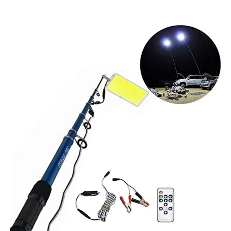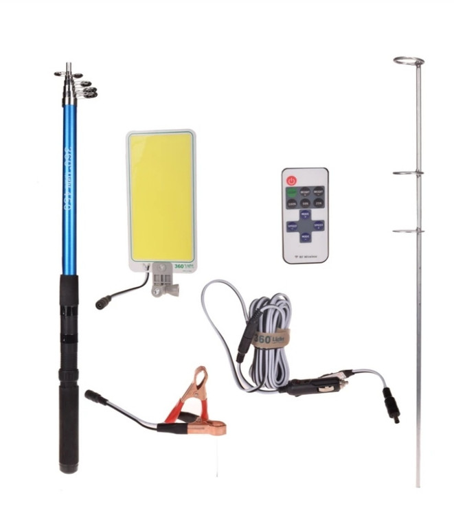 چراغ روشنایی کمپینگ 360 درجه لایت تلسکوپی، که به آن چراغ لنسری یا ماهیگیری (Fishing Light) نیز گفته می شود، وسیله ای مناسب جهت کمپینگ، مسافرت، لامپ تعمیر خودرو، روشنایی فضای باز و محیط های تاریک می باشد. چراغ کمپینگ با ریموت کنترلی که دارد یکی از محصولات پرطرفدار و پرکاربرد برای کسانی که قصد سفر و کمپینگ دارند به حساب می رود. پایه این چراغ که یک لنسر سبک است بصورت تلسکوپی باز می شود و تا ارتفاع 5 متر قابل افزایش و از استحکام قابل قبولی برخوردار است. یکی از مزایای این چراغ، پایه مستحکم فلزی قابل تنظیم در قسمت زیر آن می باشد که قادر است در زمین فرو رود و لنسر درون آن قرار گیرد تا چراغ به حالت ایستاده استفاده شود. کابل بلند این کمپینگ لایت به طور مستقیم و با دو گیره اتصال مخصوص، به باتری خودرو متصل می گردد. چراغ کمپینگ تلسکوپی با کنترل از راه دور، به شما این امکان را میدهد تا در مواقع ضروری و یا در کمپ ها و همچنین پیک نیک های خود، منبع نوری فوق العاده ای داشته باشید و با قابلیت افزایش ارتفاع آن می توانید نور را از بالا و در ارتفاع قرار دهید تا بیشترین فضای ممکن را روشن نمایید. با داشتن کنترل از راه دور، برای کم کردن و یا خاموش و روشن نمودن دستگاه نیازی به نزدیک شدن به اتصالات و یا دستگاه نداشته و به راحتی و از راه دور و حداکثر فاصله 15 متری آن را انجام خواهید داد.