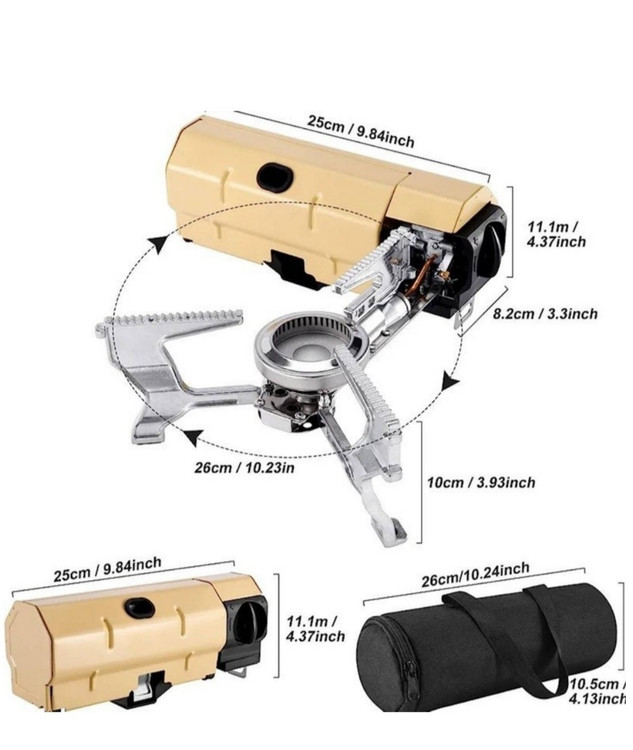 ابعاد و وزن این محصول نسبت به کارایی که دارد بسیار سبک و کم جا است، ابعاد صفحه این محصول برابر است با 26 × 10 سانتی متر و همچنین ابعاد کیس آن 25 × 9 × 10.5 سانتی متر است. گفتنی است که این محصول از استیل، آلومینیوم و فلز و پلاستیک ساخته شده است که کیفیت ساخت بسیار بالایی دارد. اجاق گاز مسافرتی تاشو 1001 دارای قدرتی برابر با 2600 وات است و همچنین دارای میزان مصرفی برابر با 120 گرم در هر ساعت است. بر روی این محصول یک عدد فندک سرخود تعبیه شده است.