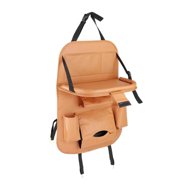 کیف نظم دهنده پشت صندلی خودرو را می توان پرفروش ترین و کاربردی ترین نظم دهنده داخل خودرو دانست، که رفته رفته به یکی از وسایل ضروری داخل خودرو تبدیل شده است. این کالا با در نظر گرفتن امکاناتی که در هنگام استفاده از خودرو و مخصوصا درسفر مورد نیاز سرنشینان است، سعی در ایجاد راحتی و آسایش برای آنان کرده است. بدنه اصلی این کیف از جنس پارچه برزنتی با کیفیت بوده، و نوع طراحی آن به گونه ای است که با داشتن آن می توانید برای همیشه با هرج و مرج وسایل داخل خودرو خداحافظی کنید. در قسمت بالای این کاور یک میز پیشخوان تاشوی چسبی جمع و جور قرار دارد که می تواند هم به عنوان میز غذاخوری کودکان استفاده شود و هم محلی برای قرار دادن اشیاءِ همچون کتاب, موبایل, تبلت و ... . توجه داشته باشید که هم در حالت بسته بودن میز و هم در حالت باز بودن آن دو جیب در دسترس شما قرار دارد که محل مناسبی برای قرار دادن انواع وسایل داخل خودرو خواهد بود. در بخش پایینی این کیف یک قسمت صرفا مختص دستمال کاغذی تعبیه شده و با استفاده از آن برای همیشه مشکل دسترسی سرنشینان عقب به دستمال کاغذی را حل خواهید کرد. در طرفین این قسمت، دو محفظه جهت قرار دادن انواع بطری، لیوان و یا قمقمه طراحی شده است. همچنین محفظه ی بزرگتری در بالای این قسمت قرار دارد که میتواند محل مناسبی جهت قرار دادن چتر، روزنامه، کتاب و ... باشد. نصب این کاور به پشت صندلی خودرو بسیار آسان و از طریق سگک از بالا و بندهای تعبیه شده از پایین خواهد بود. استفاده از این کیف علاوه بر اینکه به بی نظمی وسایل و اشیای داخل خودروی شما پایان خواهد داد، طراحی بسیار لوکس و زیبای آن نیز قطعا به زیبایی فضای داخلی خودروی شما خواهد افزود.