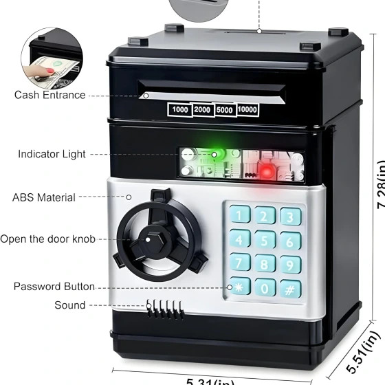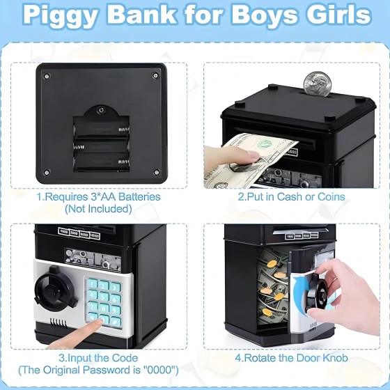 قلک رمزدار اسباب بازی مناسب برای سرگرم کردن و آموزش پس انداز و امور مالی به کودک است. قلک رمزدار، گاوصندوق کوچک و اختصاصی است که به کودک امکان میدهد تا پول های خود را پس انداز کرده و در صورت نیاز از آن برداشت نماید. امکان تغییر رمز قلک به کودک کمک میکند که اعداد را به طور غیرمستقیم بیاموزد. به یادسپردن رمز قلک هم به آنها، اهمیت به خاطرسپردن و یا یادداشت موضوعات مهم را می آموزد. لازم به ذکر است که برای راه اندازی این قلک نیاز به سه عدد باطری قلمی (AA) داریم.رمز کارخانه 0000 میباشد و دستور تغییر رمز در روی جعبه صندوق موجود است.