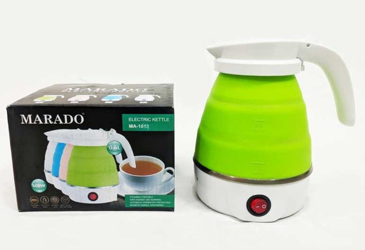 کتری برقی مسافرتی تاشو مارادو مدل MA-1613 یک محصول بسیار عالی و کارآمد برای کسانی ست که اغلب اوقات خود را در گردش و مسافرت هستند، و دوست دارند بدون آنکه فضای زیادی از ماشینشان اشغال شود، یک کتری مخصوص تهیه چای وآب جوش نیز همراه خود داشته باشند تا بتوانند در حین استراحت یک چای داغ دلنشین نیز نوش جان کنند. این کتری از جنس سیلیکون بسیار با کیفیت و درجه یک می باشد که کفی آن نیز از استیل درجه یک بوده ودر پوش باز شو آن نیز از مزایای دیگر آن می باشد. مخصوص زمانهای سفر،کوهنوردی وگردش در طبیعت یا منزل با قابلیت تاشدن است.