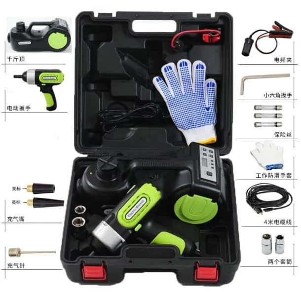 دستگاه جک هیدرولیک که دارای کمپرسور و چراغ قوه نیز میباشد _ آچار بکس _ دستکش _ میله سایز 2 جک _ کابل برق فندکی _ کابل برق با گیره سوسماری _ دو قطعه سوکت سری آچار بکس در دو سایز