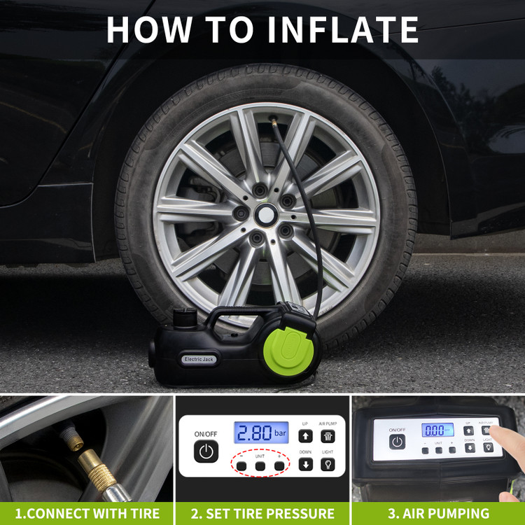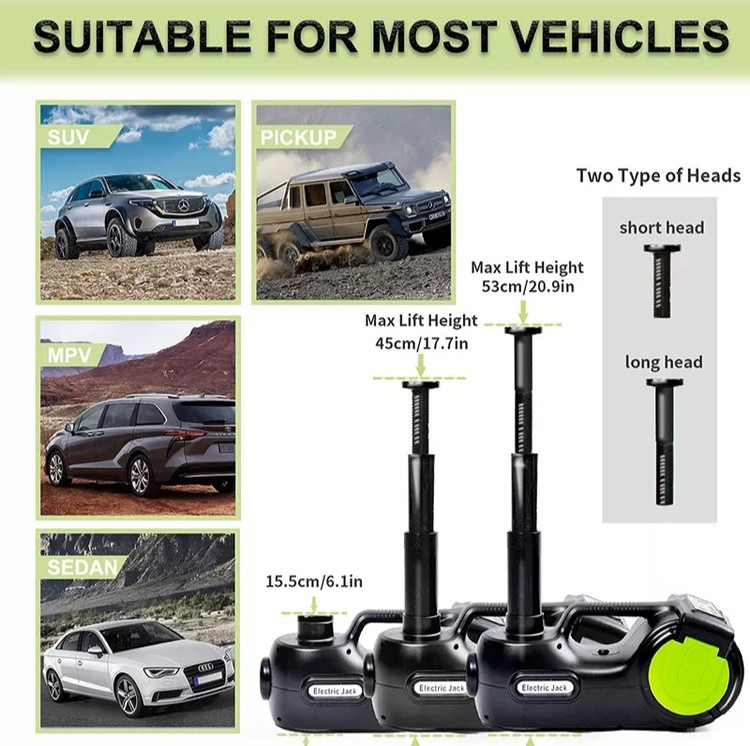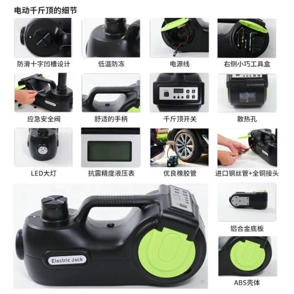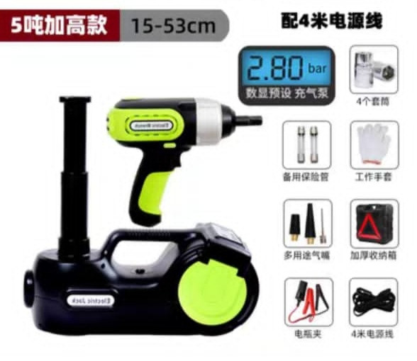 جک برقی هیدرولیک خودرو شاسی بلند مدل ۵ تنی ۵۳ سانتیمتری (پک کامل آپاراتی جک و پمپ باد و بکس برقی و چراغ قوه)