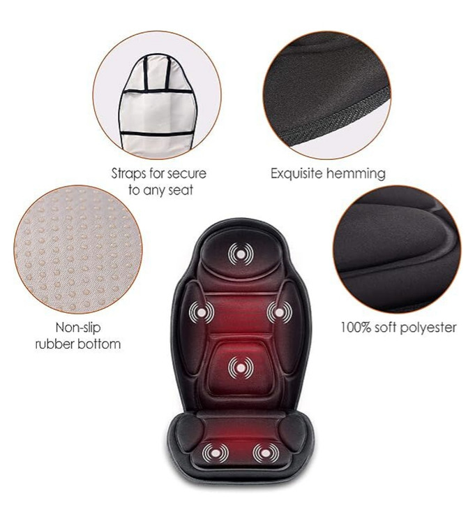 ویژگی ها: – پد ماساژ راحت، نرم – این بالشتک ماساژ برای استفاده در ماشین، منزل یا محل کار مناسب است، که راهی آسان برای کاهش استرس و فشارهای روزمره بر بدن شما ناشی از سفر، کار و سایر عوامل استرس زا است. – مجهز بودن به دستگاه های محافظ حرارتی اضافه بار و فیوز اضافه بار، استفاده از کوسن را ایمن تر می کند. – ۵ موتور ویبره تعبیه شده می تواند به شما یک ماساژ راحت پشت، گردن، کمر و همچنین ران ها بدهد. – این محصول می تواند پشت، گردن، کمر و غیره را ماساژ دهد و خستگی، تنش عضلانی، فشار را از بین ببرد و به سرعت به شما قوت دهد. – این محصول دارای ولتاژ ۱۲ ولت ایمن است که توسط میکرو کامپیوتر کنترل می شود. استفاده بسیار ایمن – با ۸ حالت ماساژ می توانید حالت های مختلفی را برای ماساژ قسمت های مختلف انتخاب کنید. – تنظیم لرزش صندلی با ۳ سرعت. می توانید قدرت ماساژ را تنظیم کنید. – به منظور استفاده بهتر از این محصول، سیستم با زمان بندی خودکار. محصول به طور خودکار خاموش می شود. – ظاهری زیبا، مناسب برای طیف وسیعی از افراد. – می توانید بنشینید یا دراز بکشید، استفاده از آن بسیار راحت است.