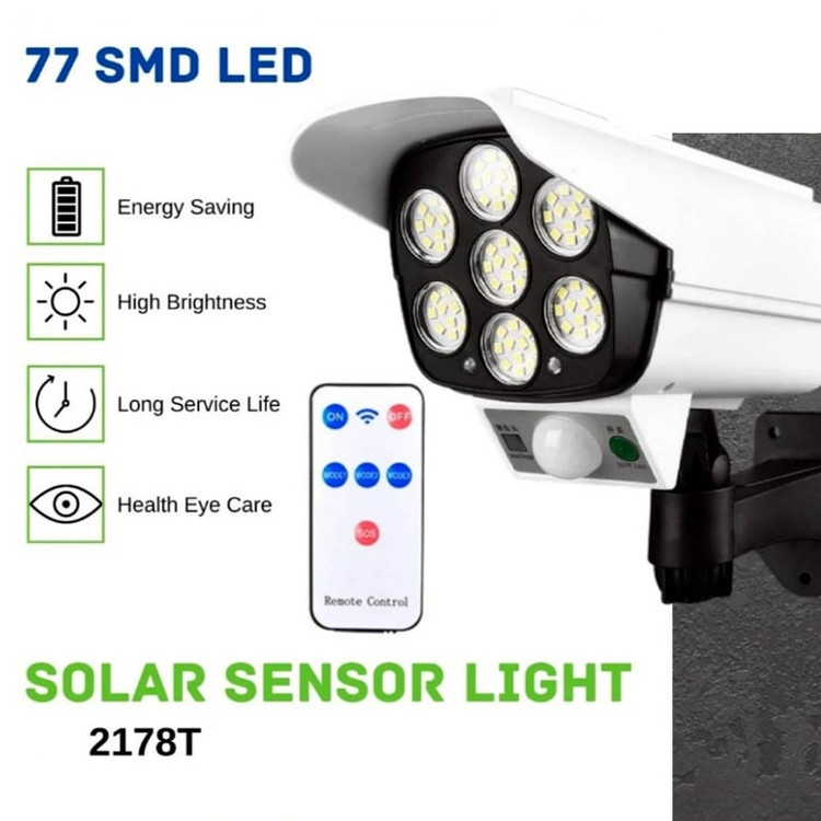 چراغ سنسور دار خورشیدی مدل 2178T نوعی از چراغ های سولار خورشیدی با طرح دوربین می باشد که دارای سنسور حرکت در شب بوده و هنگام تشخیص حرکت، حالت نور قوی روشن می شود. همچنین این پروژکتور در حالت خاموشی دارای چراغ چشمک زن قرمز است که برای شبیه سازی حالت ضبط دوربین اعمال می شود. این محصول دارای نور مهتابی است و همچنین دارای کنترل برای تغییر حالت و نوع استفاده از آن نیز است. تعداد حالت استفاده از این پروژکتور، 3 حالت می باشد. طرز کار پروژکتور به این صورت است که در شعاع پنج متری آن در صورت حرکت، خودکار روشن می شود و به مدت 20 ثانیه روشن می ماند که وسیله ای مناسب برای تامین امنیت می باشد. این محصول هیچ نیازی به سیم کشی و برق ندارد و انرژی خود را از نور تامین می کند. این نورافکن خورشیدی دارای 77 ال ای دی اس ام دی می باشد که دارای استاندارد IP65 بوده و می توان آن را بی هیچ نگرانی بیرون خانه در مقابل باران و رطوبت نصب کرد.
