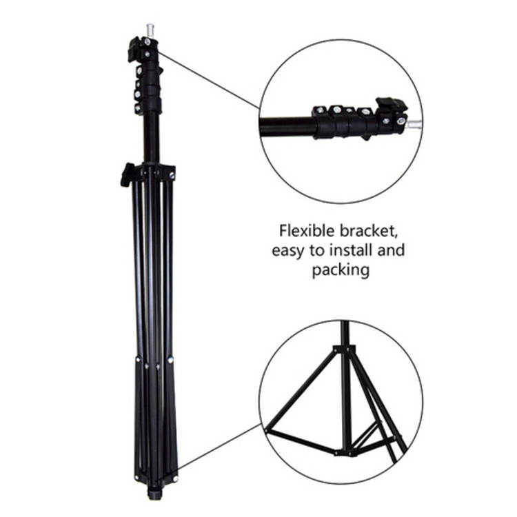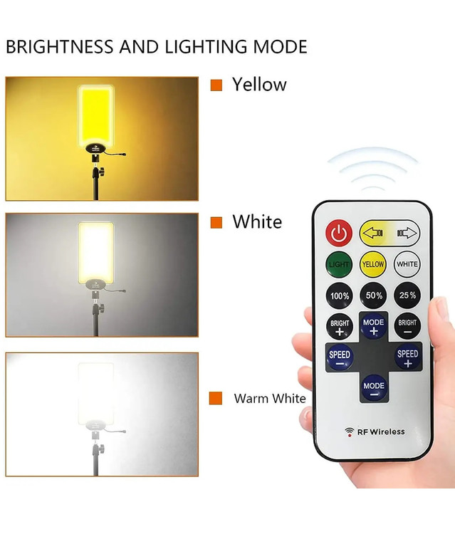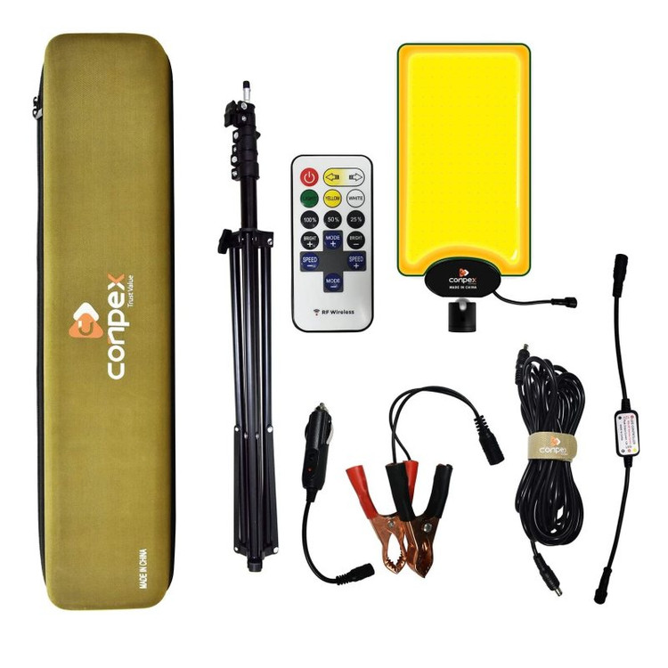 پنل لامپ، ریموت کنترل، شارژر فندکی ماشین، گیره باتری، میله جمع شونده ۳.۵ متری، سه پایه، کیف مخصوص حمل