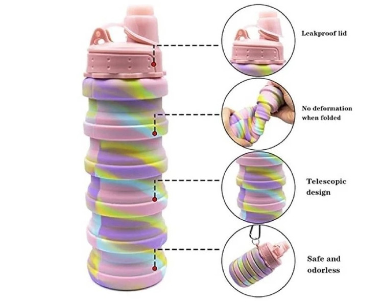قمقمه سیلیکونی تاشو قابلیت جمع و یا باز شدن را دارد و دارای لبی اسان نوش و درب ضد نشتی نیز می باشد .قمقمه سیلیکونی تاشو نیم لیتر قابلیت نگهداری دمای سرد و گرم هست. مواد به کار رفته در سیلیکون BPA فاقد مواد مضر و سرطان زا از دیگر ویژگی های این قمقمه بسیار زیبا می باشد. قمقمه سیلیکونی تاشو مناسب تمامی افراد و دارای دستگیره برای حمل راحت تر و بهتر نیز هست.